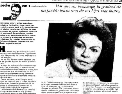 (San Juan, 12:00 p.m,) Ayer se cumplieron nueve años de la muerte de una amiga queridísima que siempre me decía que yo había nacido en Vieques, como ella, la gran actriz Iris Martínez. En sus últimos años un grupo de amigos la íbamos a visitar frecuentemente a un edificio para envejecientes casi al lado del Colegio de Abogados, entre los que recuerdo a mi compadre Gilberto Concepción Suárez, a Maria Judith Franco y Esteban de Pablo, a Vicky Espinosa y otros que lamento no recordar. En aquellas visitas nunca supe si Iris nos recordaba por nuestros nombres pues ya tenía 92 años y algunos padecimientos de esa avanzada edad.